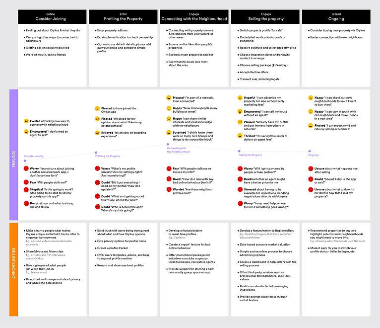 Our Seller personas led us to creating the user journey by using the 5 E's principle where the major concerns were 'App privacy' , 'Authentication of user profiles', 'how to handle without agent', and 'transparency and trust'. We ideated on some opportunities to overcome the positive and negative emotions.